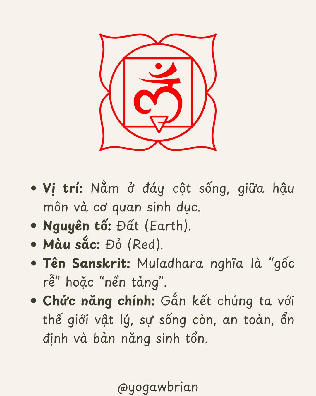 Muladhara được biểu thị và quan sát được bằng đôi mắt thấu thị dưới dạng hình vuông màu vàng, có 4 cánh hoa màu đỏ. Màu liên quan đến luân xa gốc là màu đỏ và nguyên tố của nó là đất. Có rất nhiều người giải thích những tầng ý nghĩa khác nhau của biểu tượng Hoa Sen 4 Cánh đại diện cho luân xa số 1. Nhưng với tôi 4 cánh hoa chính là hình tượng rõ ràng nhất của một con người nhận biết rõ về không gian, thời gian mình đang sống ở 4 phương trên mặt đất. Chỉ có sức mạnh của sự tỉnh thức ở trong không thời gian hiện tại mới khiến họ tiếp đất, và tạo tiền đề cho tất cả những sự phát triển cả thể xác và tinh thần của chính họ.